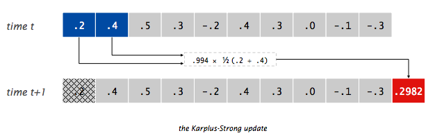 The resulting vibrations. After the string is plucked, the string vibrates. The pluck causes a displacement which spreads wave-like over time. The Karplus-Strong algorithm simulates this vibration by maintaining a bounded-queue of the N samples: the algorithm repeatedly dequeues the first sample from the bounded queue and enqueues the average of the dequeued sample and the front sample in the queue, scaled by an energy decay factor of 0.994.